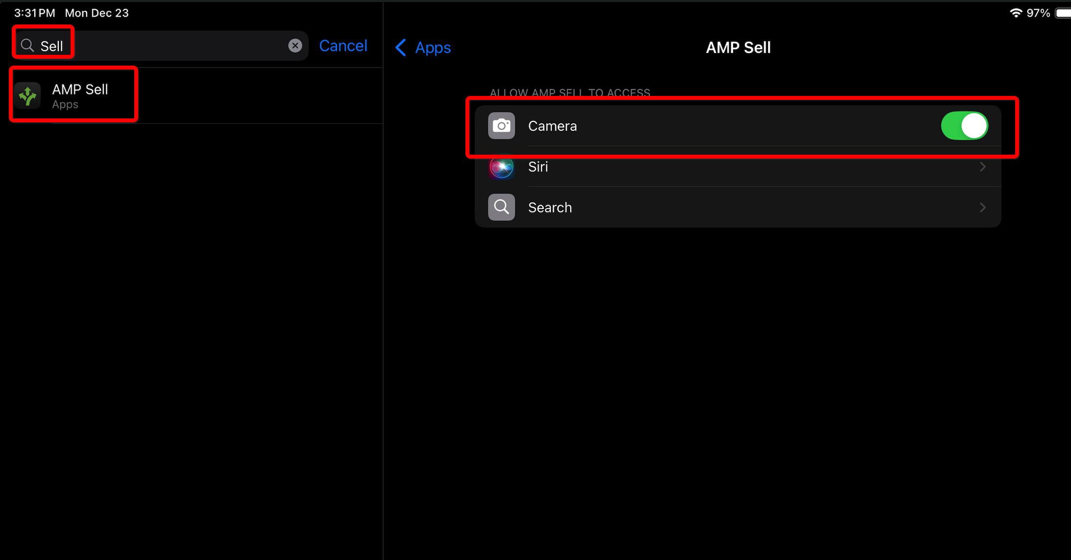 - Toggle the Camera permission to On (green) to enable the camera for AMP Sell.
