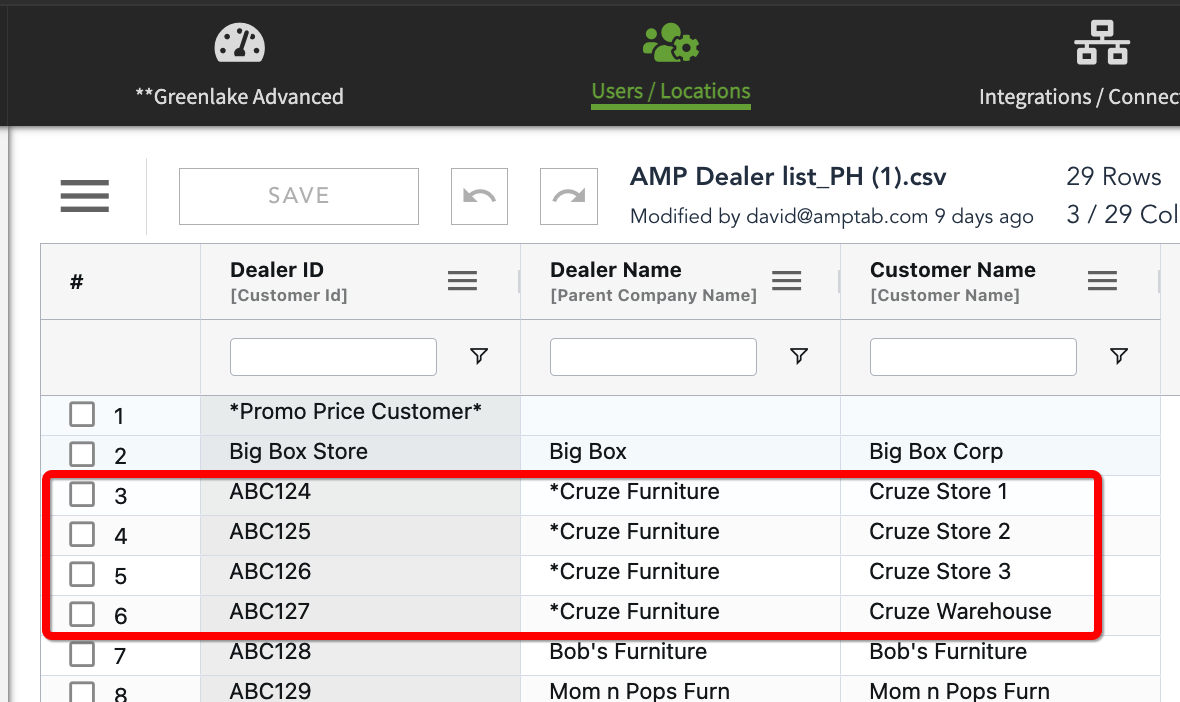 - If you don’t have the correct entries, add new rows for each location, making sure they share the same Parent Company Name but have unique Customer IDs.