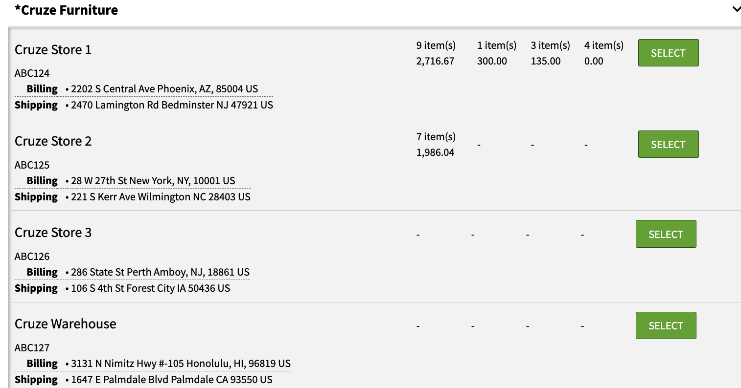- Scroll down to your customer with multiple shipping locations. You will see the company name displayed in bold, with a drop-down caret next to it (instead of a "Select" button).