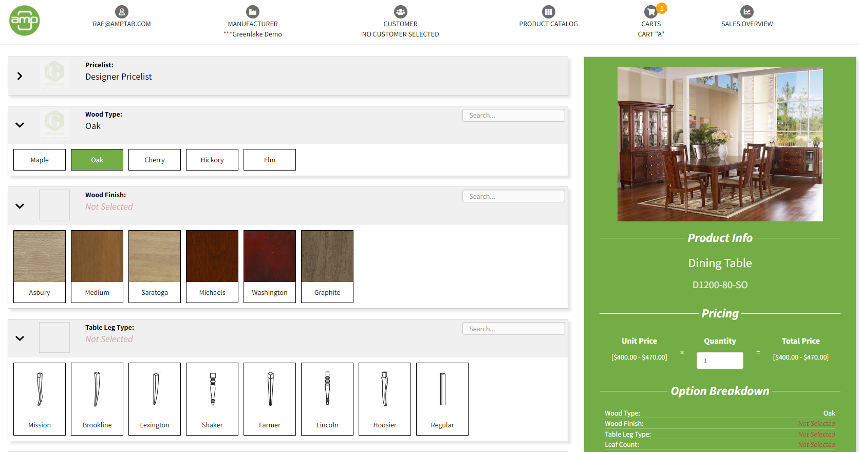 AMP Config is a powerful tool within the AMP platform designed to help you sell custom and made-to-order products. With AMP Config, you can offer products with configurable options (such as finish and fabric) that allow your customers and reps to tailor each product to their exact needs.