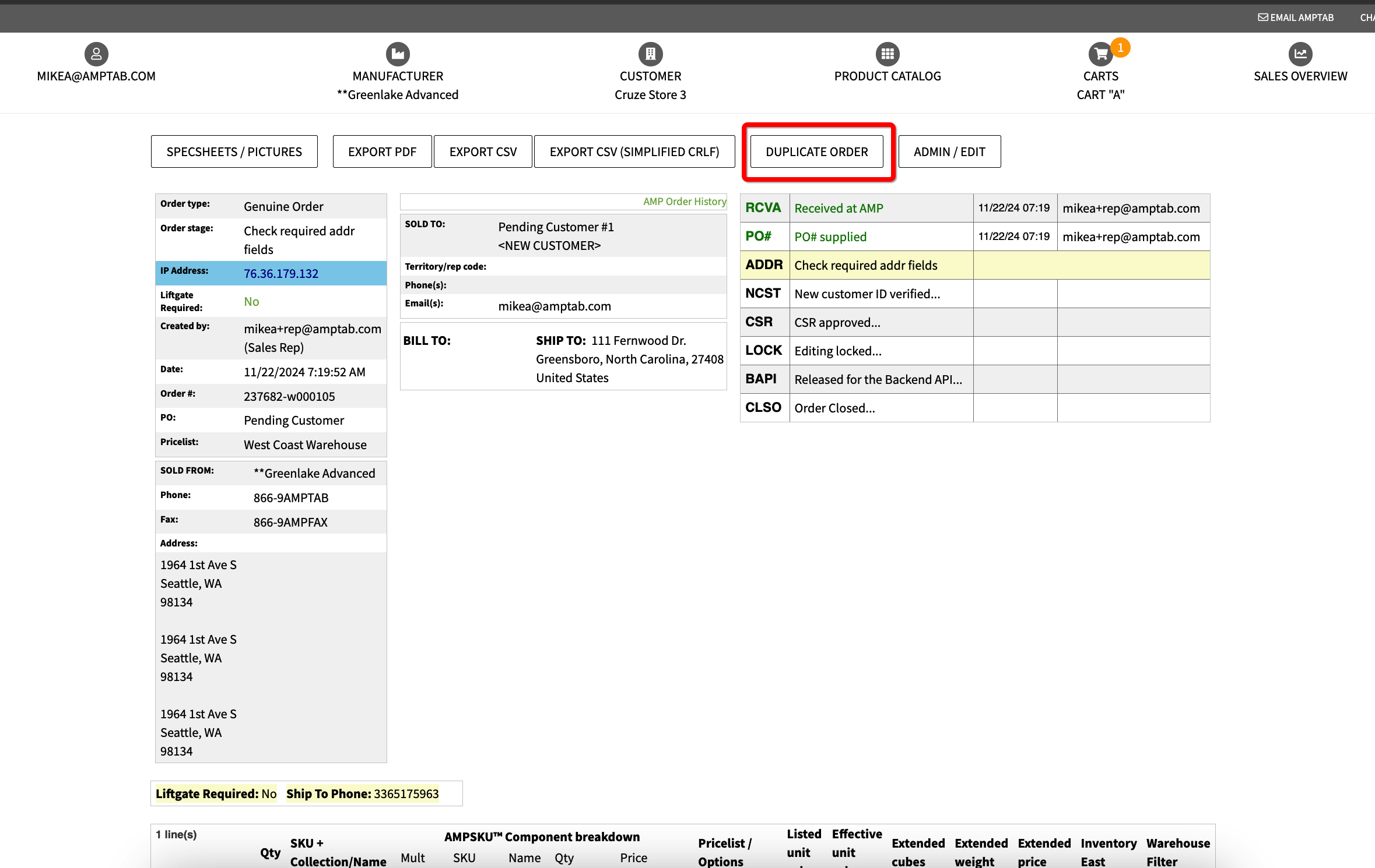 Duplicating an order in AMP Shop is quick and easy, and it includes all configurations made to items. Follow the steps below to duplicate an order:
