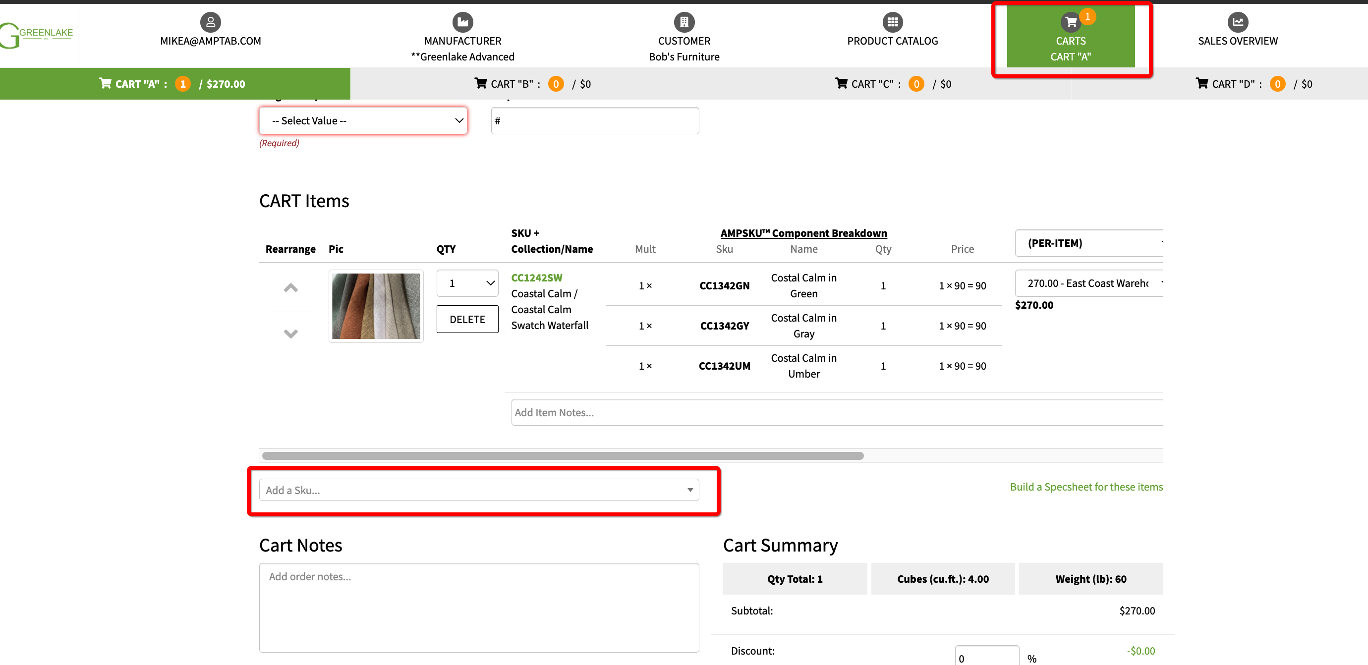 Go to the Carts tab.Click "Add a SKU..."